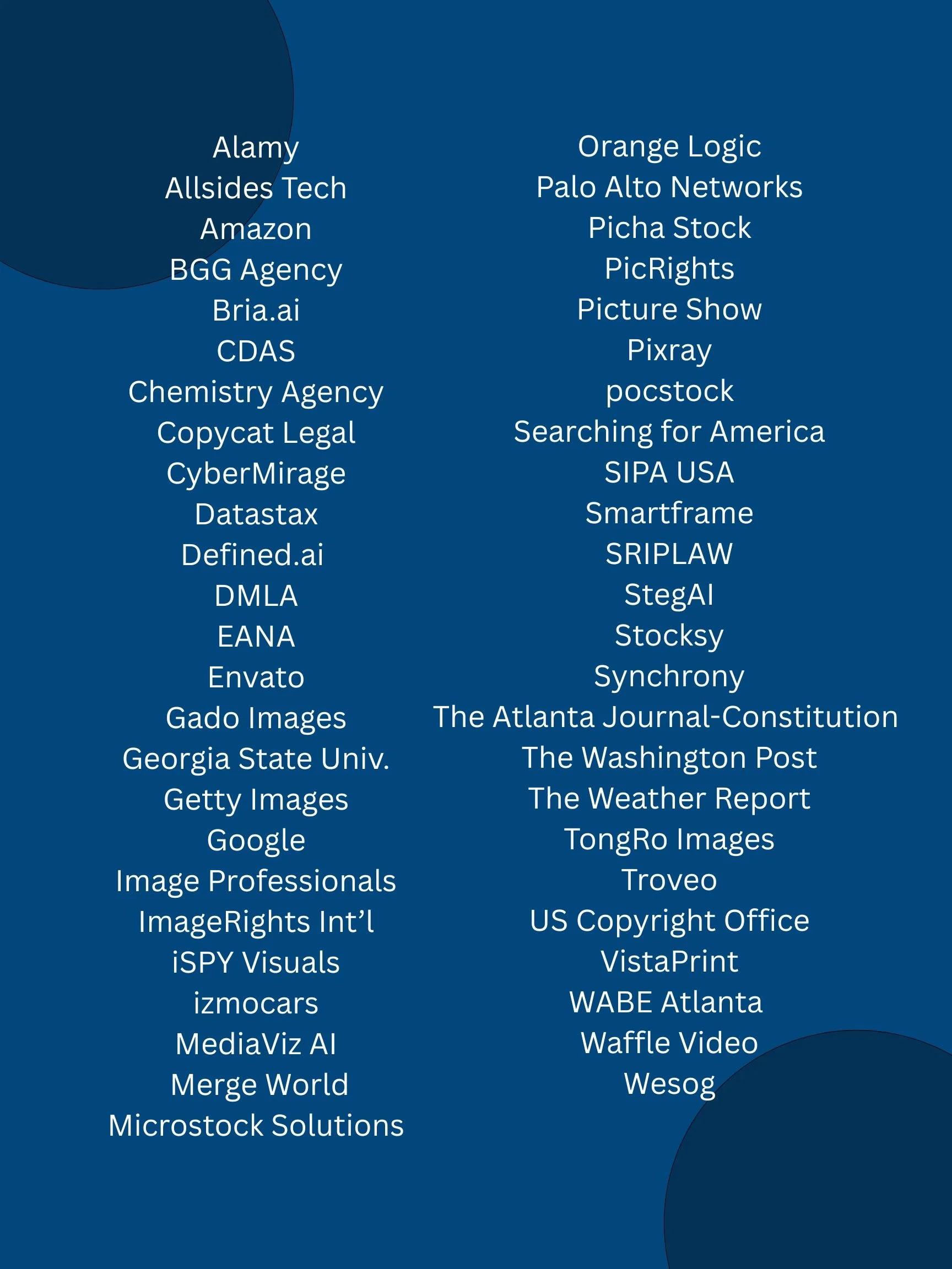 Adobe, Alamy, CNN Collection, Envato, Getty Images, Magnum, Shutterstock, Stocksy, Bria.ai, Steg.ai, Pixelz, EANA, International Photographers Association, ImageRights Int’l, TongRo Images, Microstock Solutions and many more.